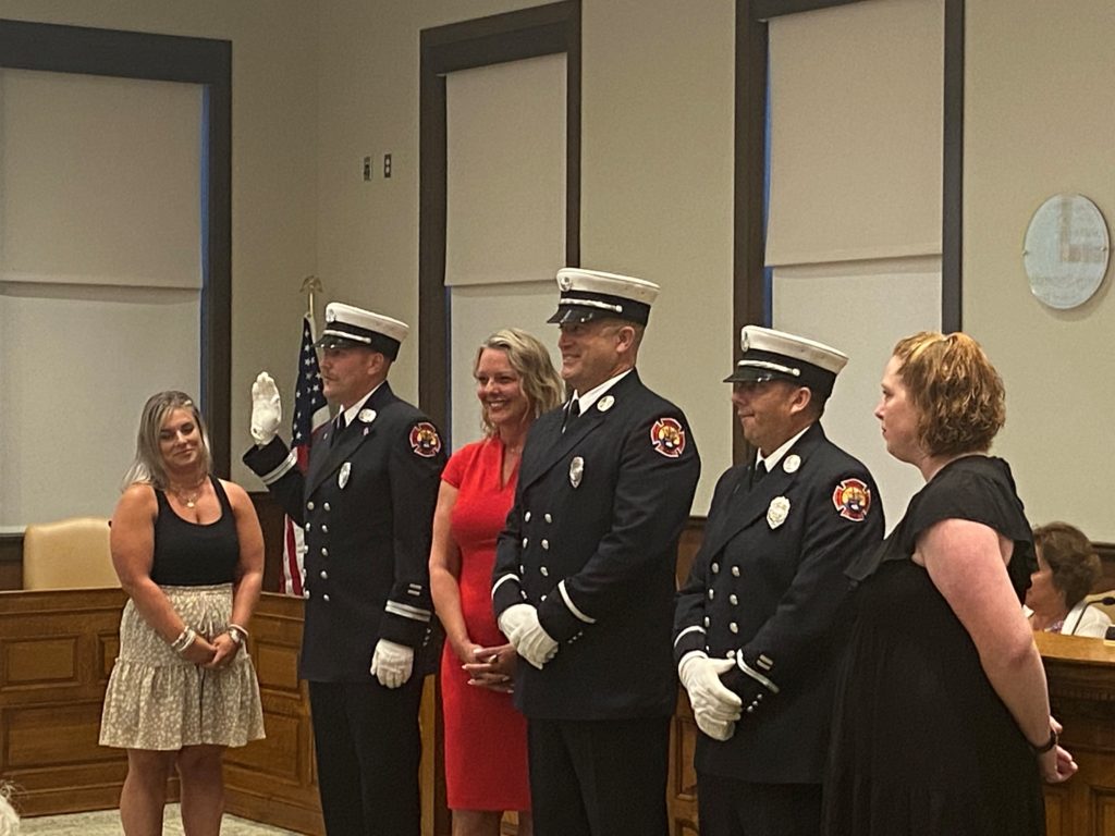 PLYMOUTH — Chief Neil Foley is pleased to announce that the Plymouth Fire Department promoted three firefighters during a badge pinning ceremony held at Plymouth Town Hall on Tuesday night.
