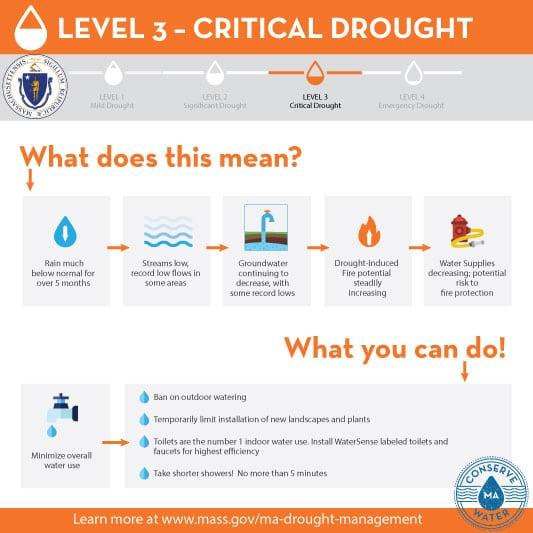 The State of Massachusetts has declared a Level 3 Critical Drought, which recognizes below-normal rainfall for five months, low to record-low stream flow, and decreasing groundwater. More than 40 percent of the state is considered to be under drought conditions. More than 130 communities in Massachusetts have restricted water use, including Reading, Danvers, Middleton, Peabody and Wilmington, to name a few.