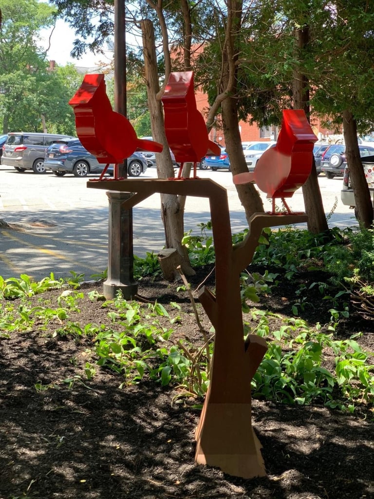 One of the most distinctive additions is the installation of two steel sculptures created by local artist Dale Rogers. The sculptures portray a cat, and a tree with bright red cardinals sitting on the branches. The donations of the sculptures were a generous gift from the Burkhart family, who are neighbors to the Square.