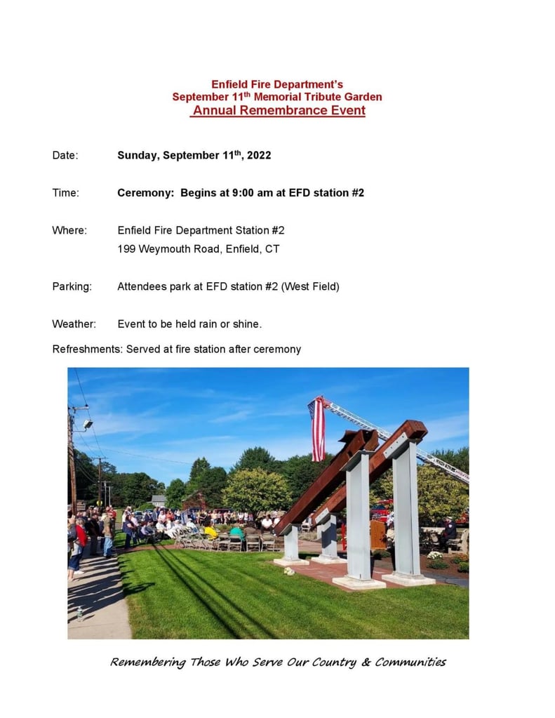 In honor of the first responders and victims of the Sept. 11, 2001, terrorist attacks, Enfield Fire District No. 1 will host an Anniversary Remembrance ceremony at the 9/11 Memorial Tribute Garden at Station #2.