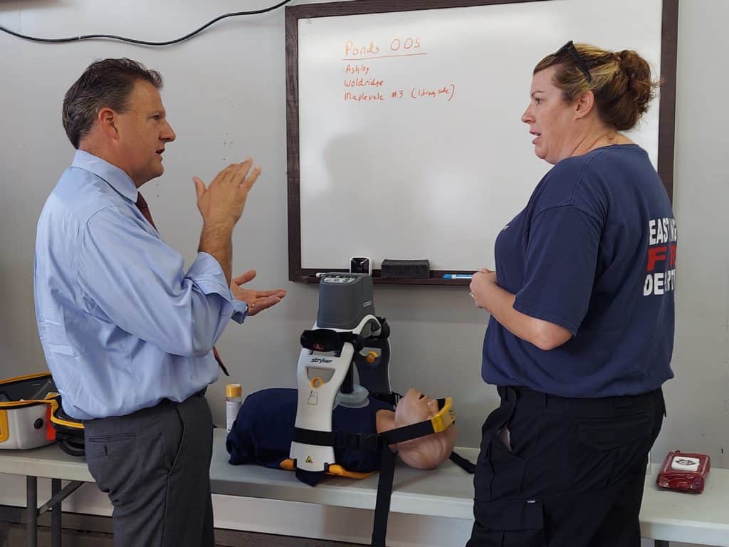 Firefighter/EMT Laurie McCarter demonstrated the Lucas Stryker compression system, which assists first responders in providing critical care on the way to the hospital.