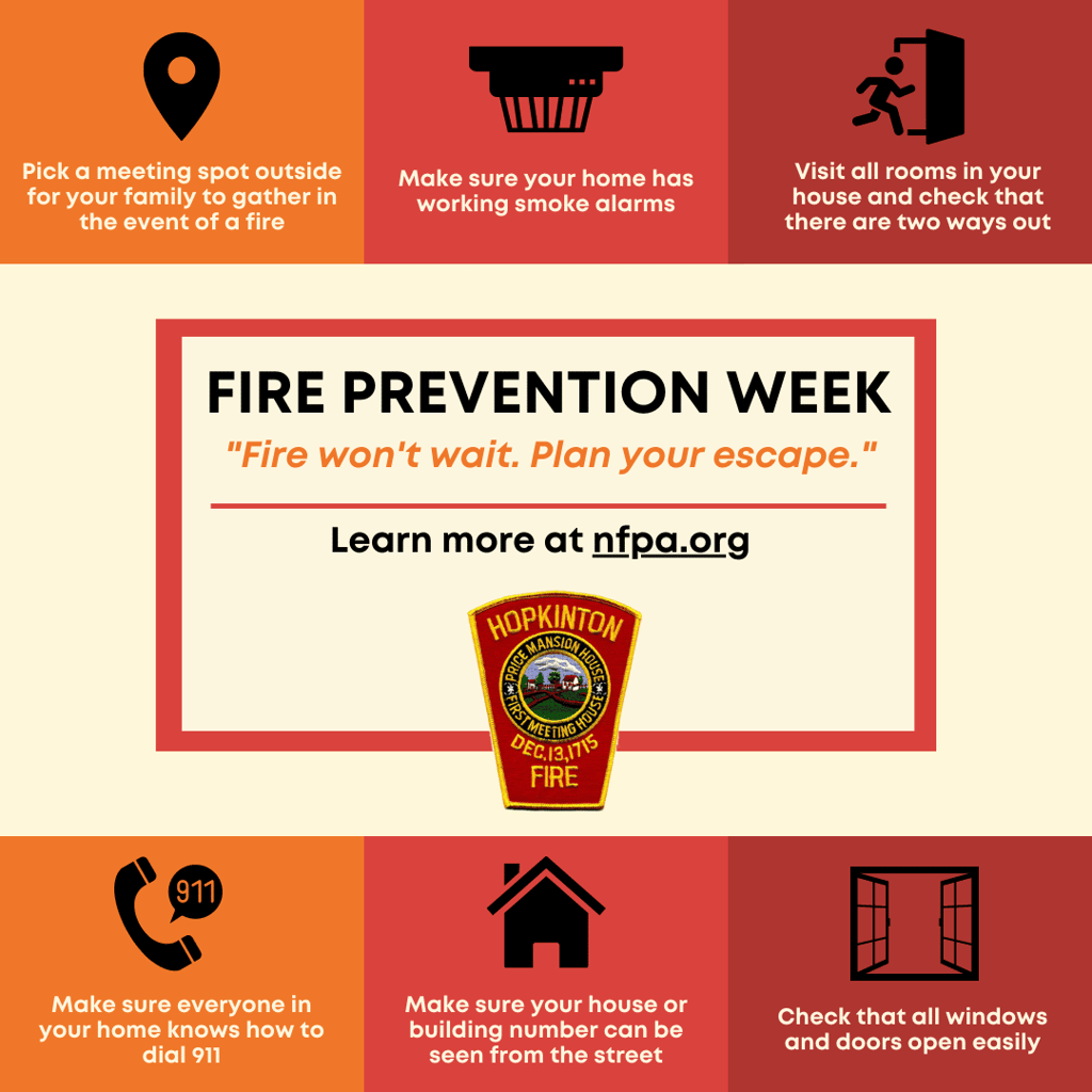 To learn more about Fire Prevention Week, or to speak to Hopkinton’s Fire Prevention officers about steps you can take to protect your family, call the Hopkinton Fire business line at 508-497-2323.
