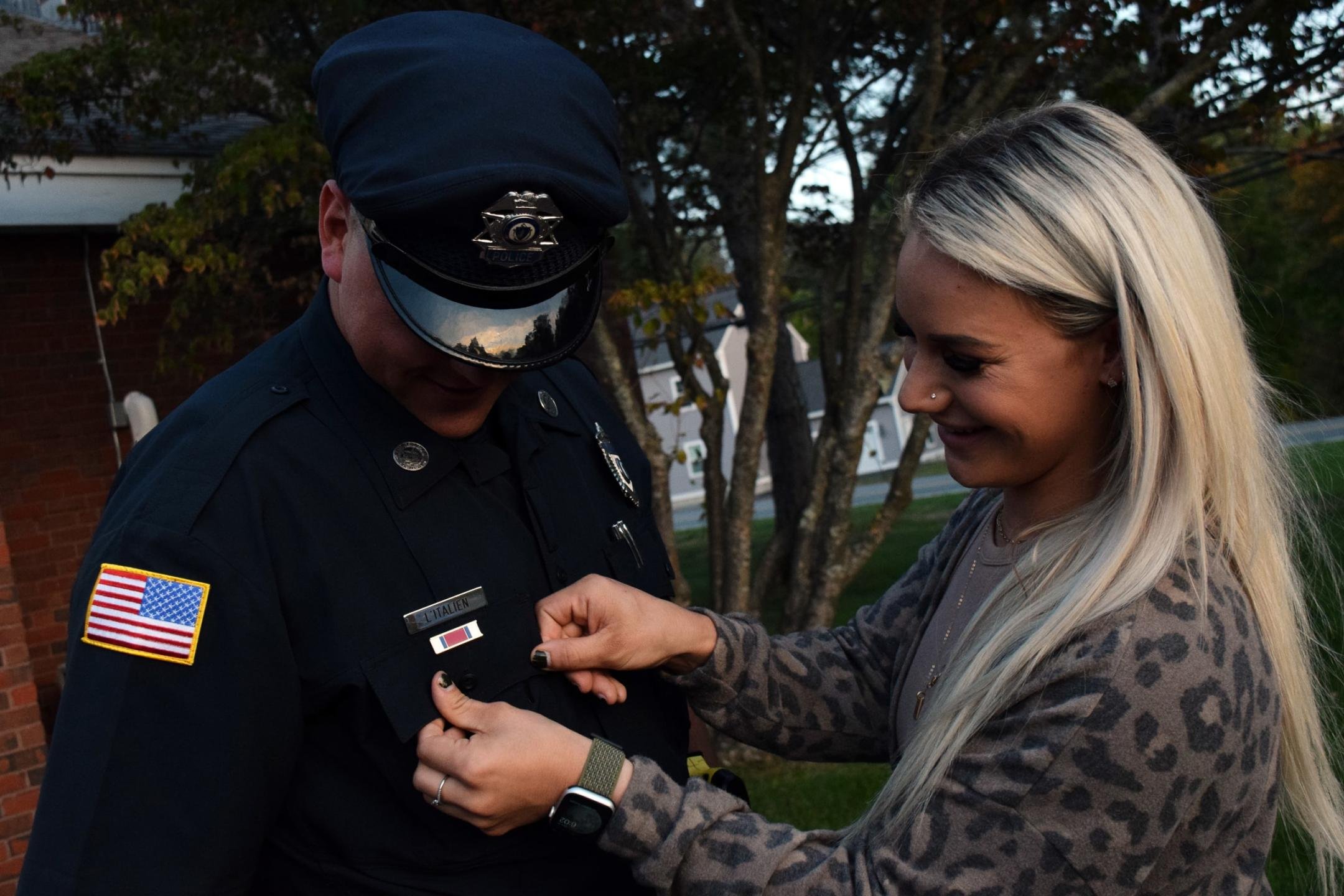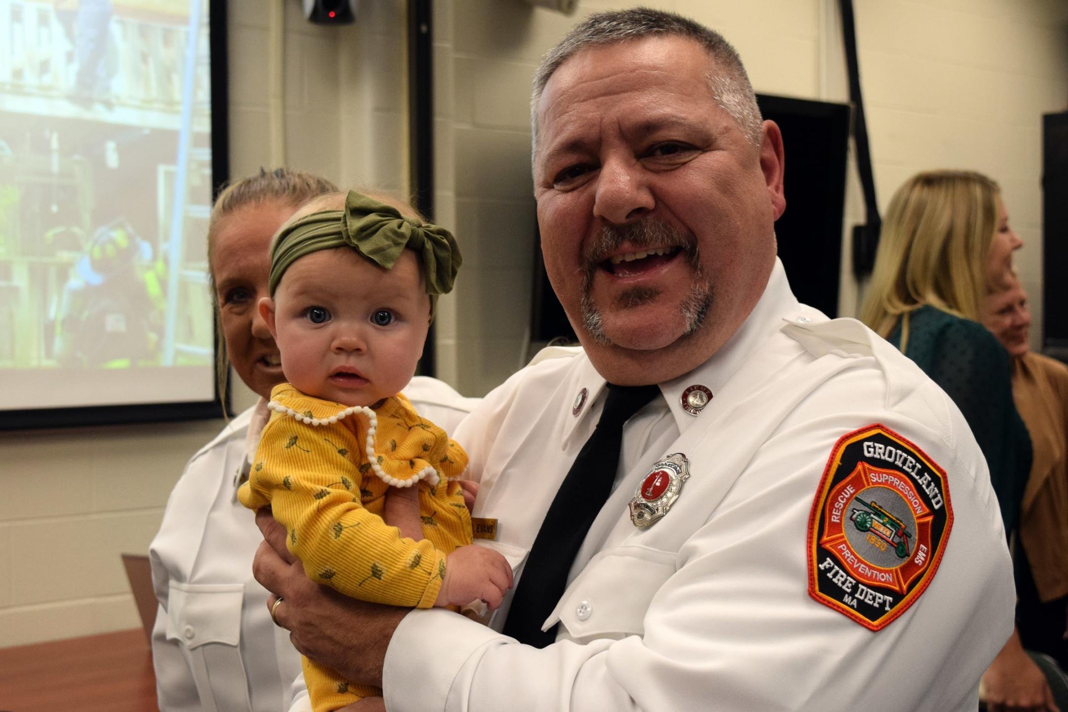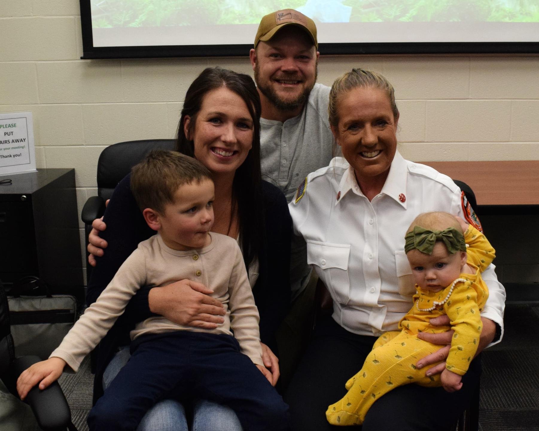 Baby Evelyn and her parents, Jon and Jaclyn Benson, attended the ceremony and were able to visit with the first responders and pose for photos together.