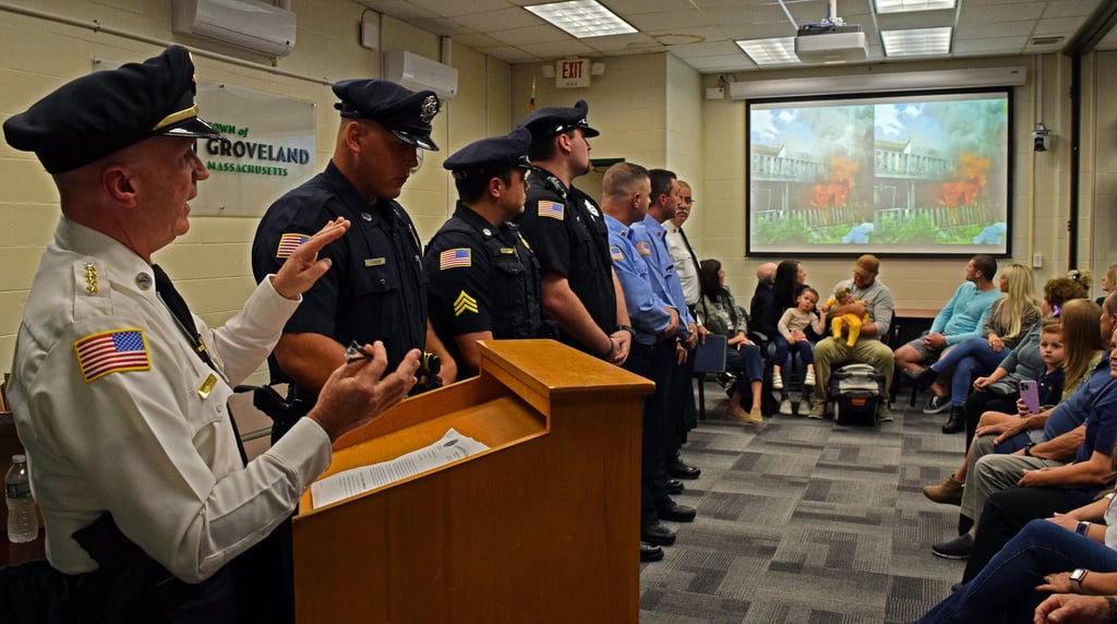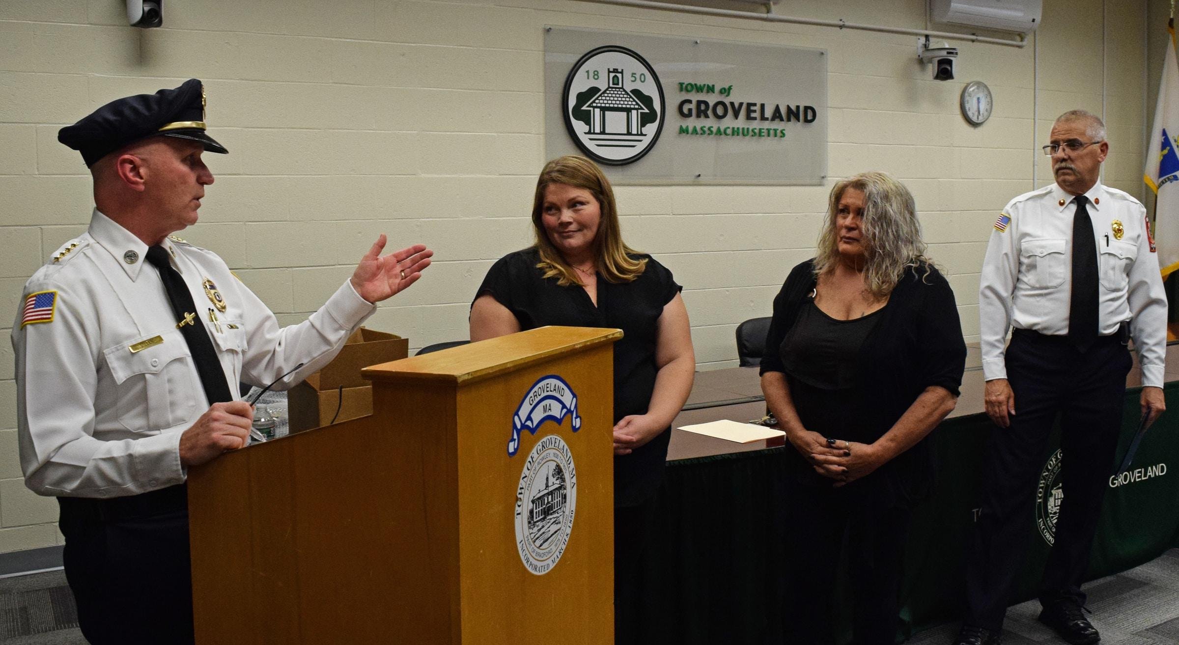 Honored for their roles in the June 24 response to a fatal fire at the Groveland Manor Apartments in which two residents were rescued, were: Firefighter Kris Vallone, Firefighter Robert Hoffman, Officer Christopher L’Italien, Sgt. Christopher Ertsos, Officer Daniel McDonald, Dispatcher Cynthia Batista, and Dispatcher Kate Pekarski.