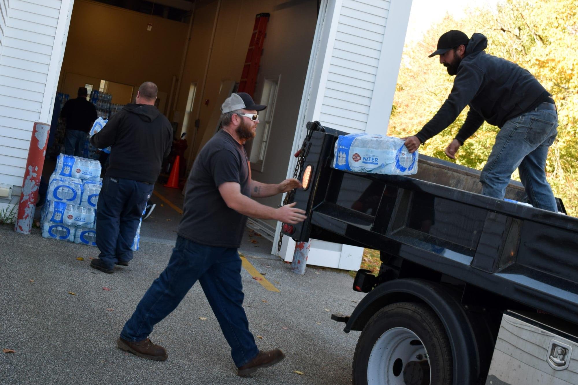 On Thursday, Oct. 20, members of the Rye Fire Department, Rye Police Department, and Rye Department of Public Works teamed up to distribute 470 free cases of water to residents in need.