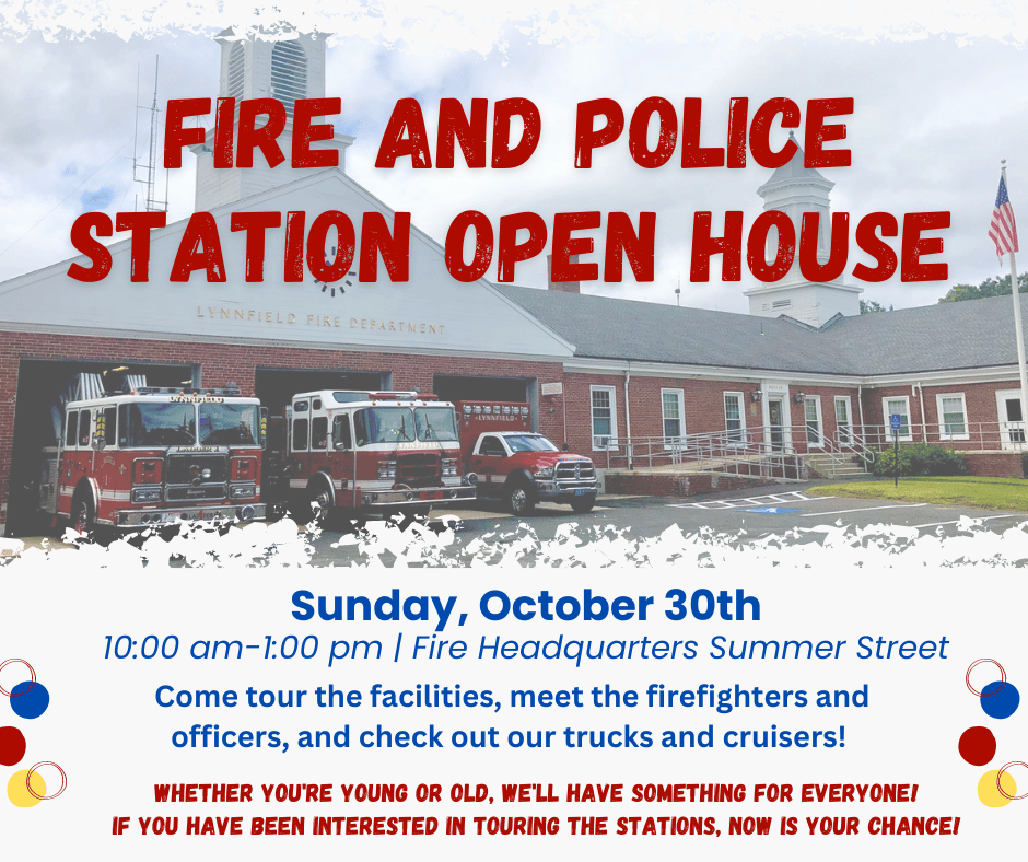 LYNNFIELD – On Sunday, Oct. 30, from 10 a.m. to 1 p.m., the Lynnfield Police and Fire Departments welcome community members to tour our facilities at 59 Summer St. The event will feature activities for all ages, including an opportunity to meet Police Officers and Firefighters and explore fire apparatus and police cruisers.