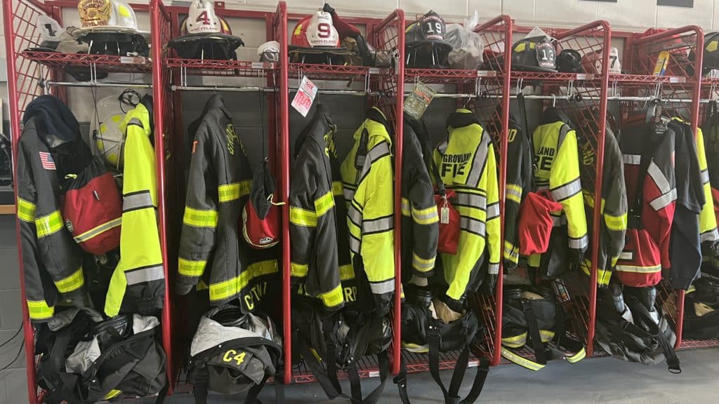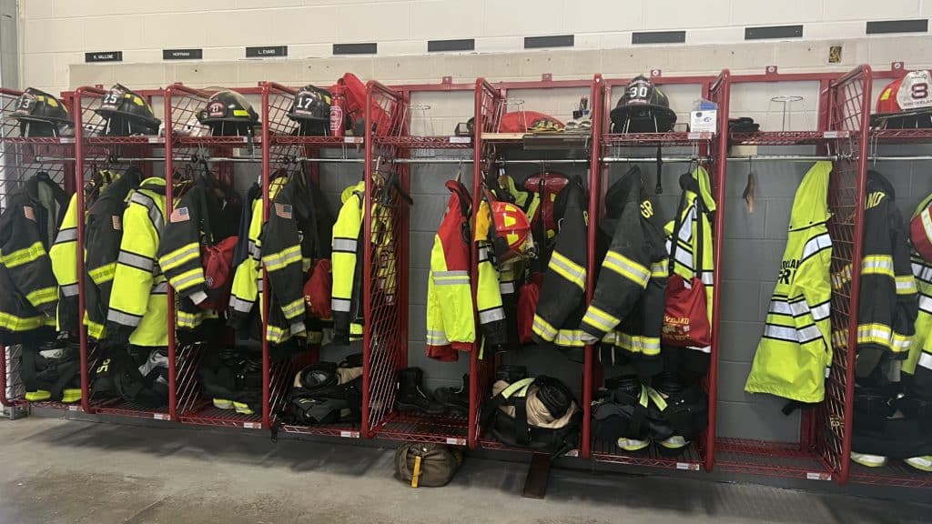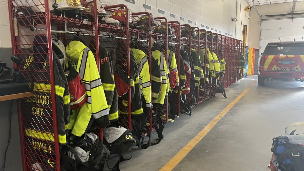 The previous gear racks were built by Groveland firefighters, and firefighters had to keep their gear on the ground, where it couldn’t dry properly between calls. If firefighters responded to a call in the rain or snow, their gear would sit in puddles, not able to dry properly, often still being wet and cold when department members raced to the next incident.