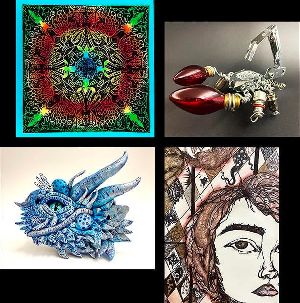 Four students from Masconomet Regional Middle School won gold key awards at the 2023 Regional Scholastic Art & Writing program. Clockwise from top left:  Ada Eisenberg’s “Radial Rhythms,” Bella Denis’ “Scorpion”, Kiera Macauley’s “Broken Stained Glass” and  Caleb Aitchison’s “Blue Dragon Eye.” (Courtesy Photo Masconomet Regional School District)