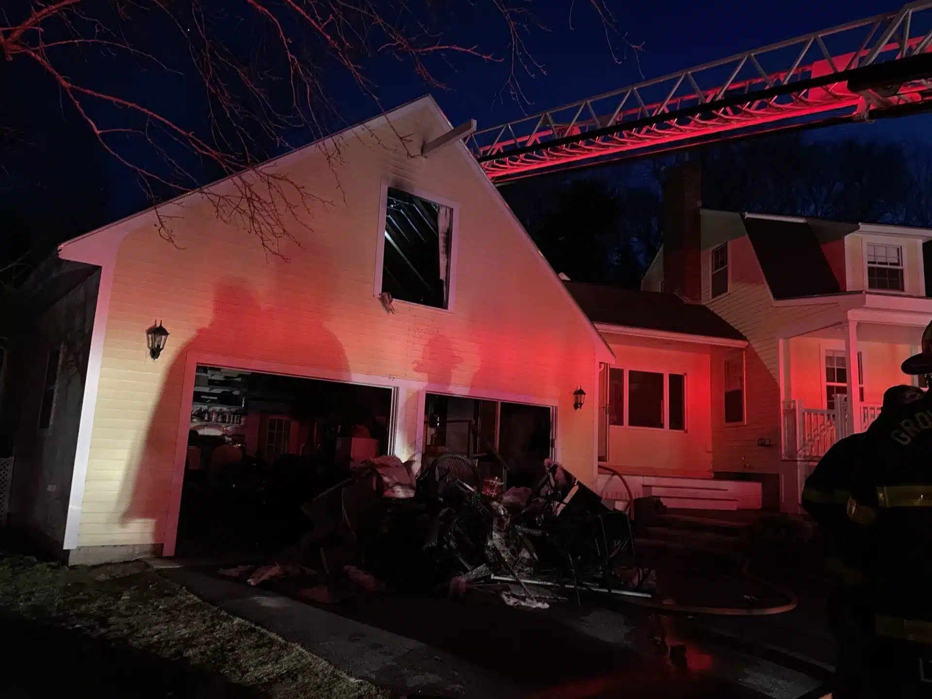 The West Newbury Fire Department and mutual aid partners successfully extinguished a residential garage fire Sunday night. (Courtesy West Newbury Fire Department)