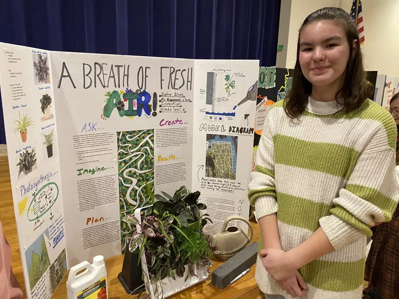 Sixth-grader Sophie Zhou won a ribbon for her invention, “A Breath of Fresh Air!” The project is a sustainable self-watering garden to clean the air.
