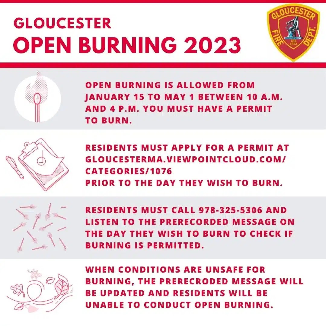 Open burning is only allowed by permit, which may be obtained online at Gloucester’s Online Permitting Central; those without internet access may visit headquarters at 8 School St. - The Department will determine daily whether open burning may be conducted safely. Status updates are available by calling 978-325-5306.
