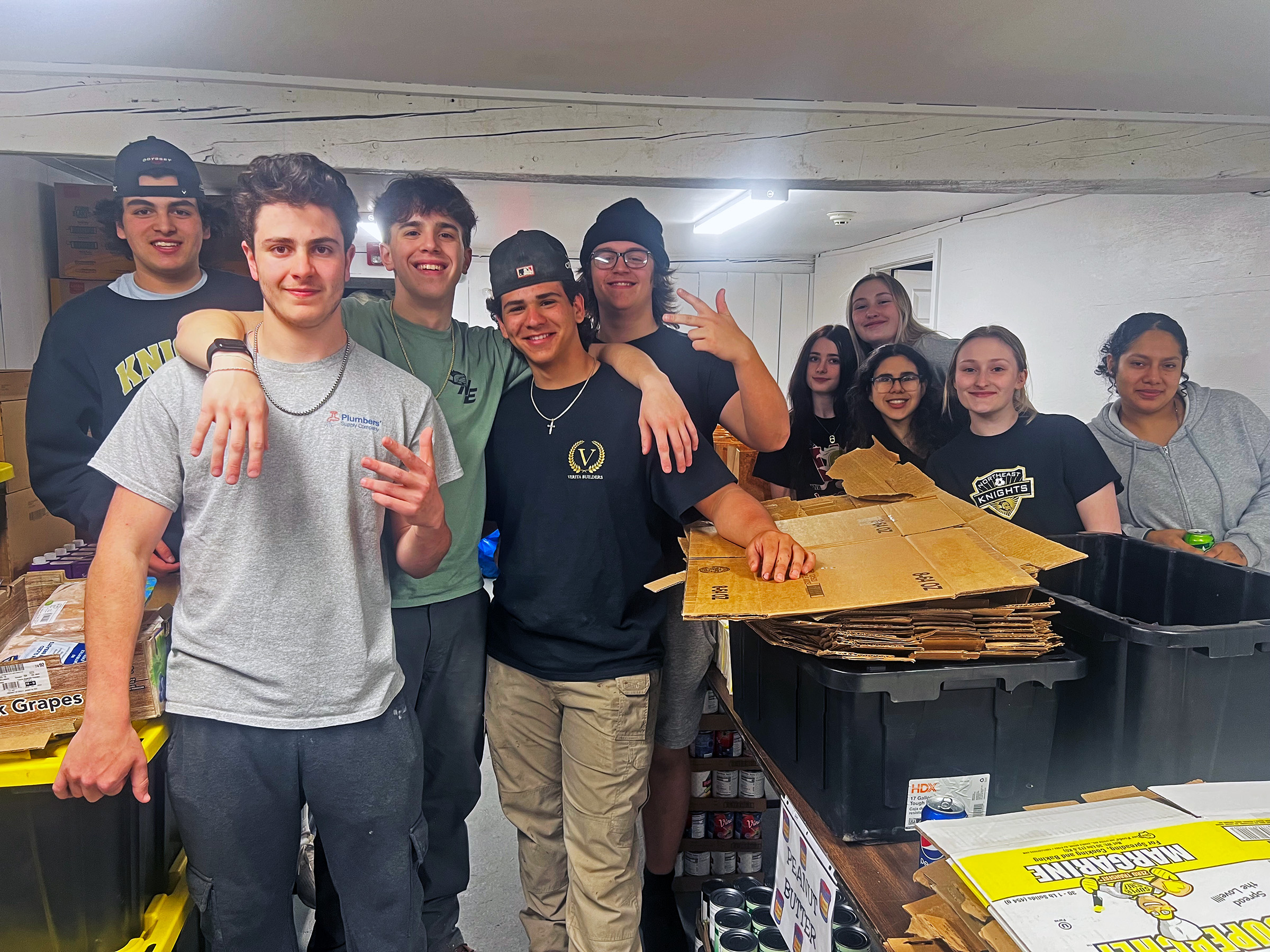 The students who contributed at the Food Pantry are Gianna Scoppettuolo, Soffia Giraldo, Mike Sousa, Alex Moneretto, Aidan Jones, Mikey Follis, Cam Correa, Emelly Acevedo, Sam Cubas, Briana Boccelli, Marisa Boccelli, and Ethan Crespo.