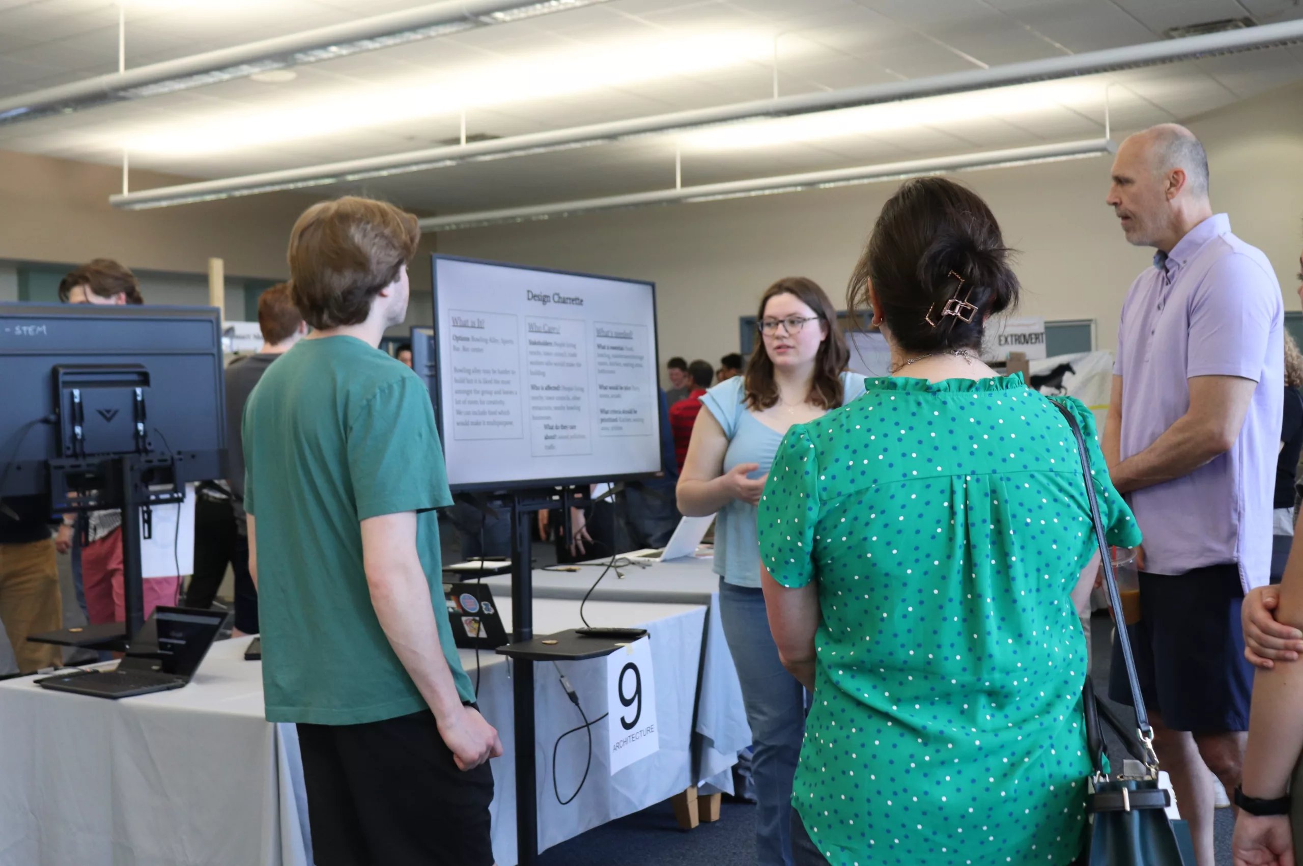 After the pitch contest, judges were able to view each project and ask students questions about their process and final product. The teams were evaluated on how well they defined and researched their problem and developed clear objectives; how well they designed a prototype, communicated the construction process, tested their prototype, acknowledged shortcomings and discussed next steps; and how well they presented their project, used effective visual aids and responded to questions posed by the judges.