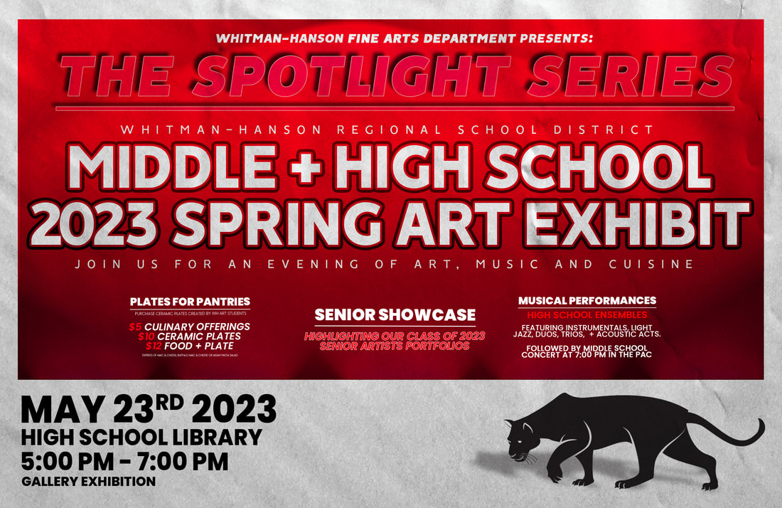 Whitman-Hanson Regional High School will hold its Senior Art Showcase on Tuesday, May 23, from 5-7 p.m. at the High School Library, 600 Franklin St. During the showcase, eight seniors will have their artwork on display. The event will be cash only and the proceeds from the sales of plates and dinner will benefit the Whitman and Hanson food pantries.