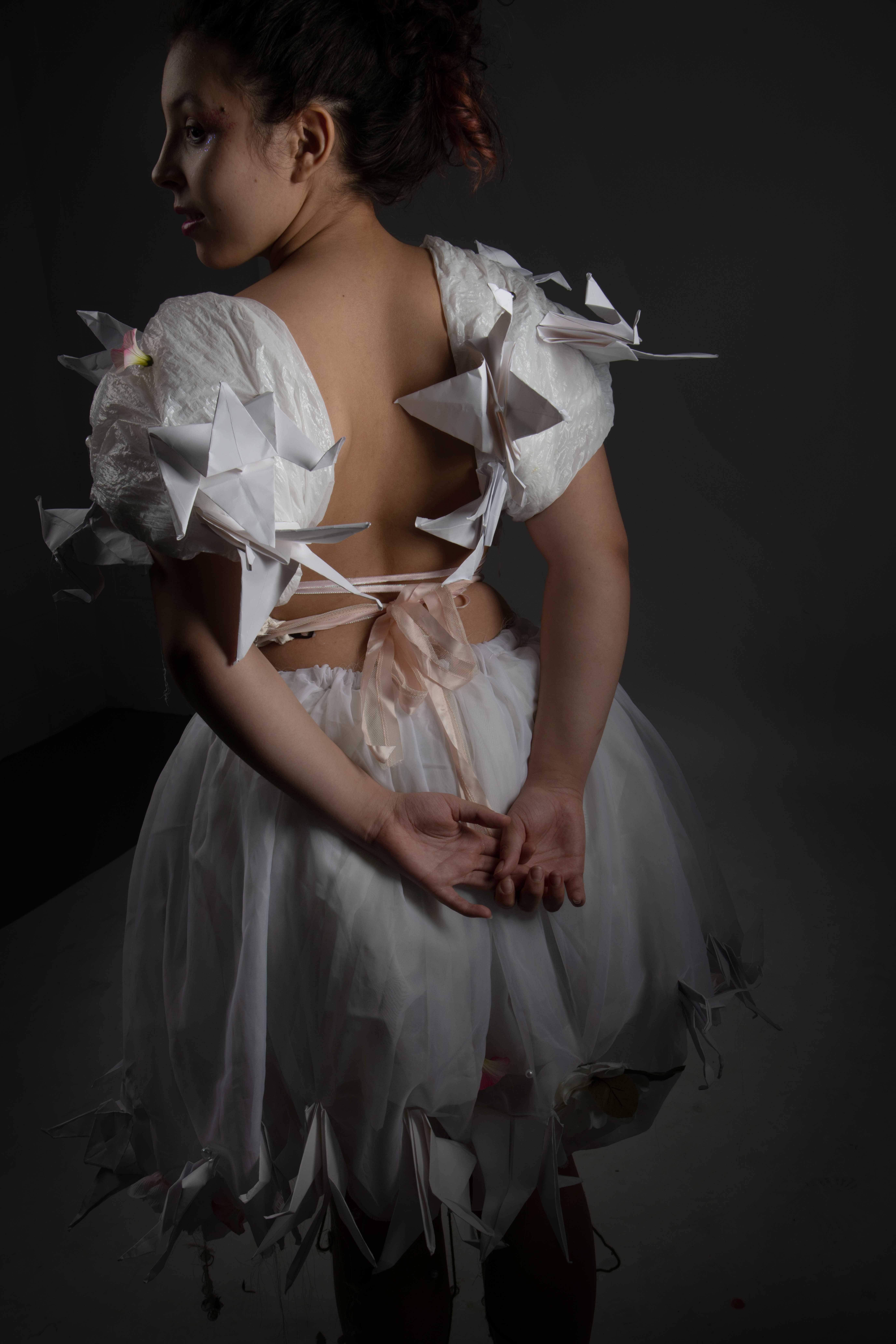 Carvalho and Nelson worked together to create their design, “Birdie.” Their garment features a tutu made with layers of sheer curtains, trimmed with paper origami birds. The puffed sleeves were fashioned from white trash bags, the corset was constructed from scrap fabric, and hooks for tightening the corset were made from soda can pop tabs. The outfit was embellished with a sparkling gem belt that was recycled from a wedding gown. The story of the design illustrated that beauty can be found in simple things and has little to do with money.
