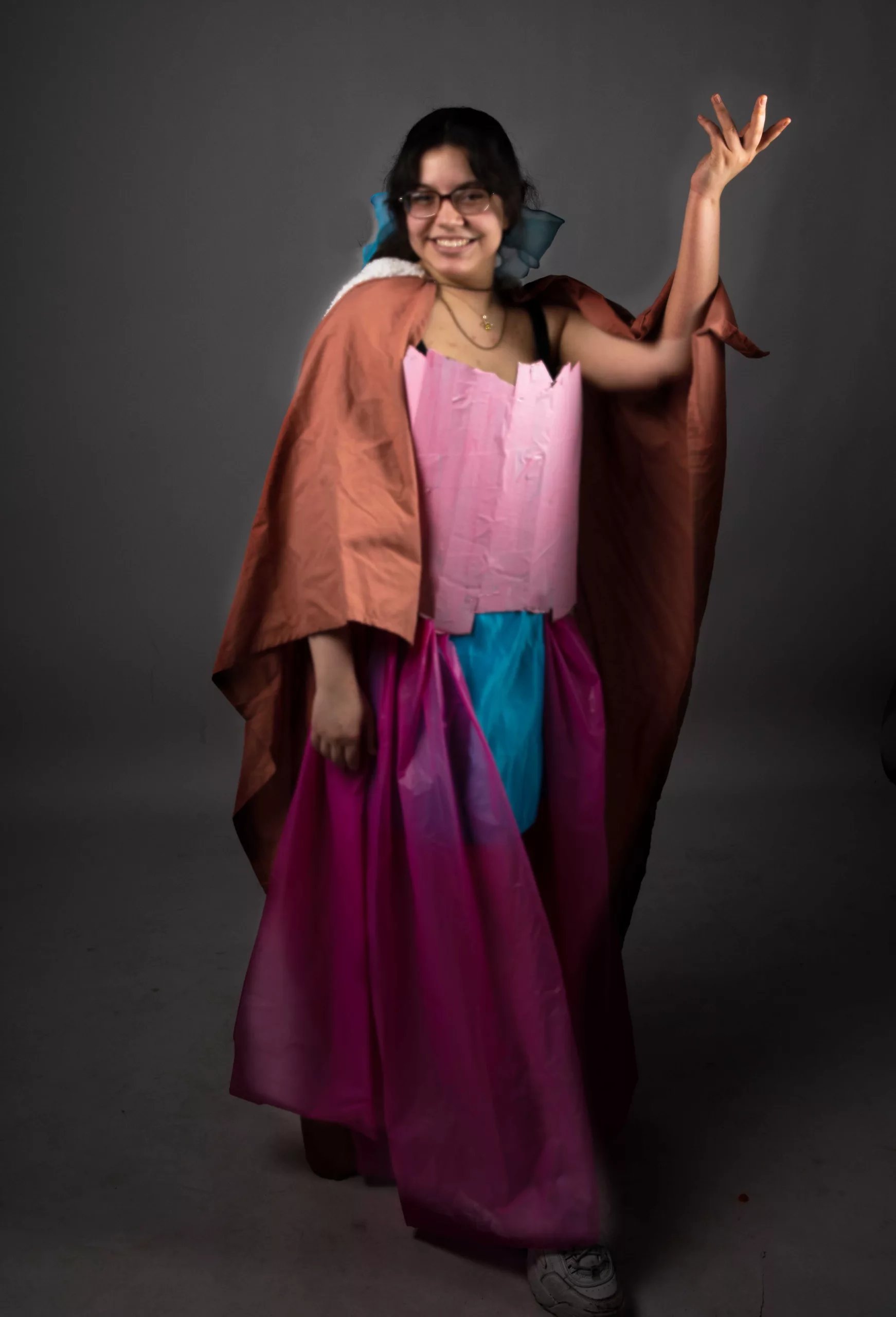 Burgos Velez and Zimmerman teamed up to create a fairy tale-inspired costume that they named “Cotton Candy Riding Hood.” The garment was fashioned from a blanket with an added hood, a cardboard chest plate, and boots made from recycled fabric.