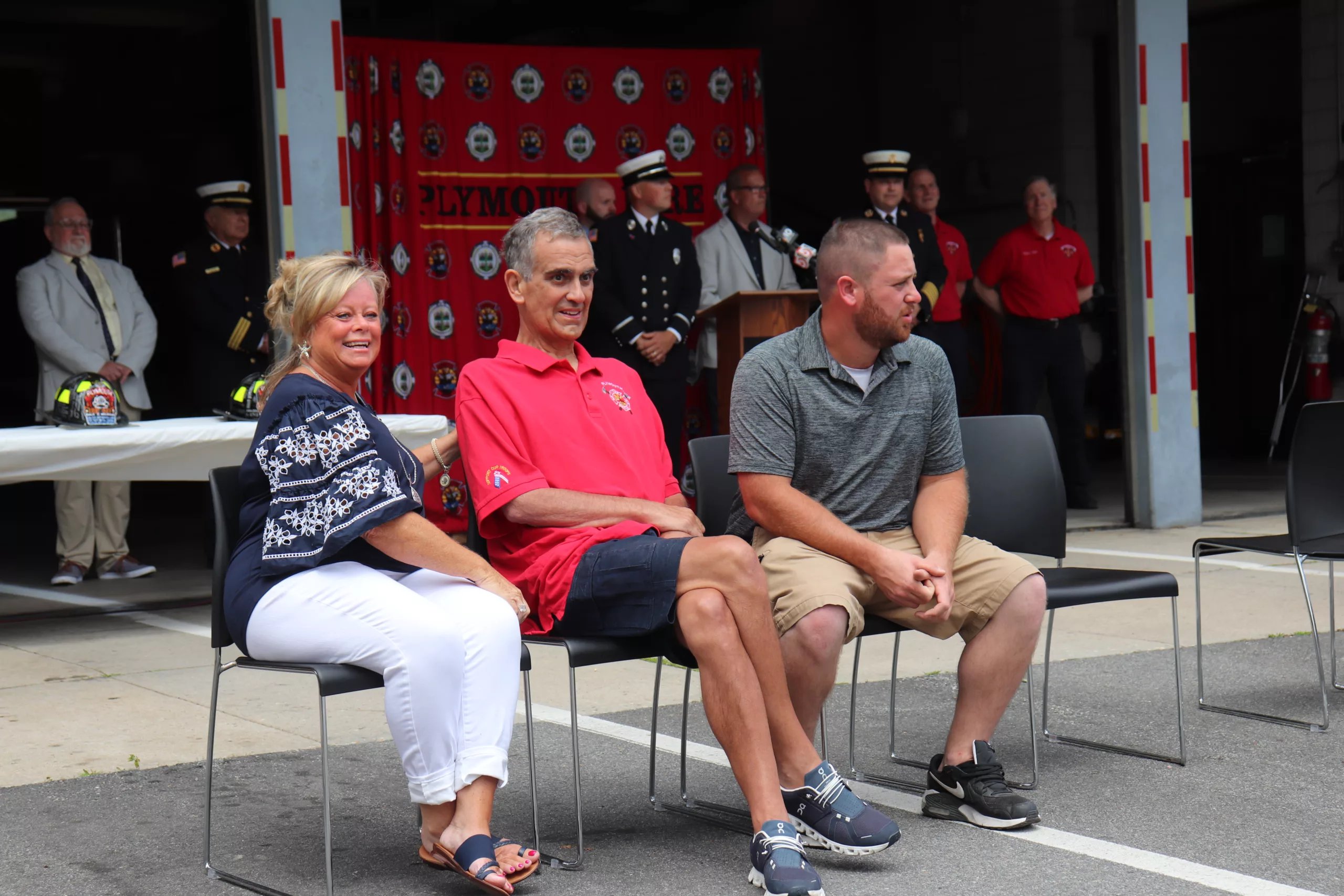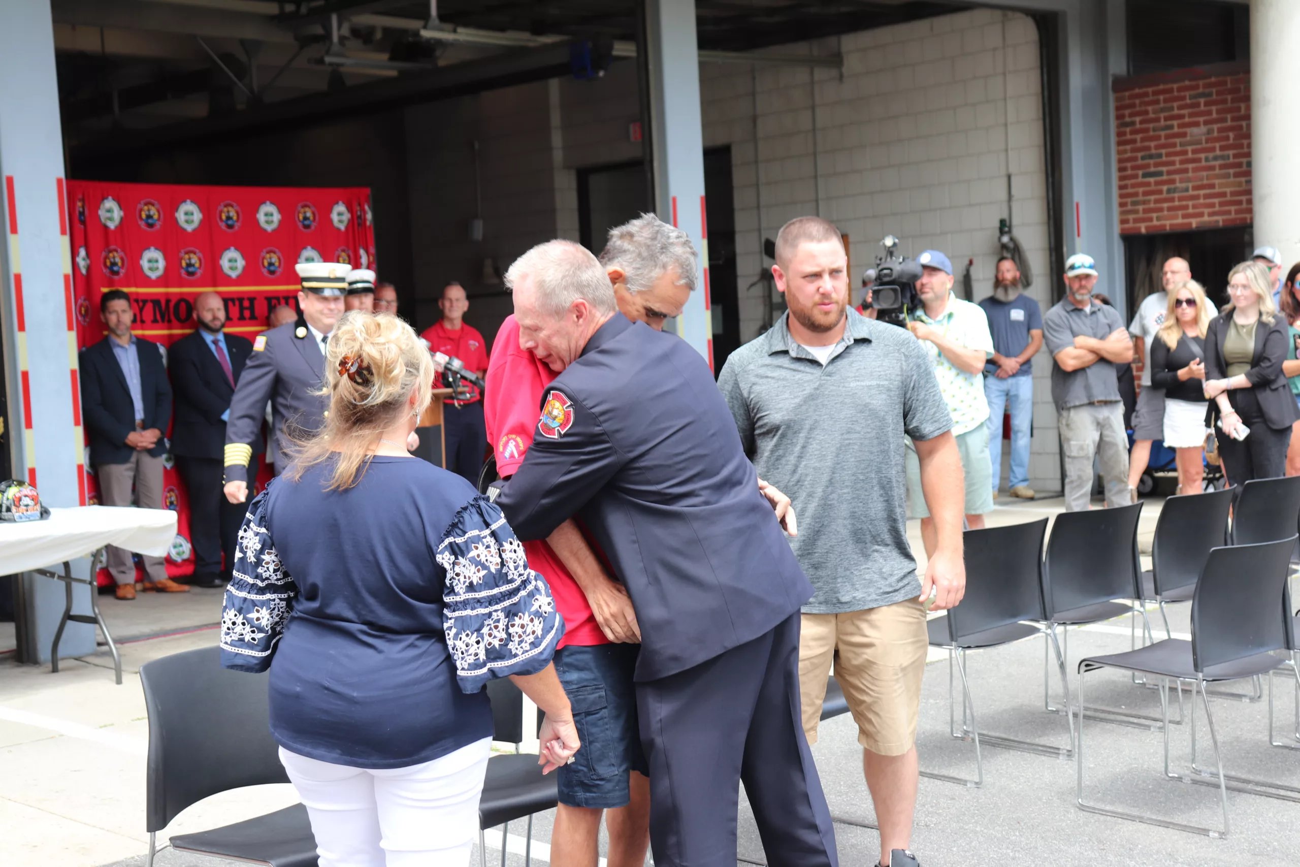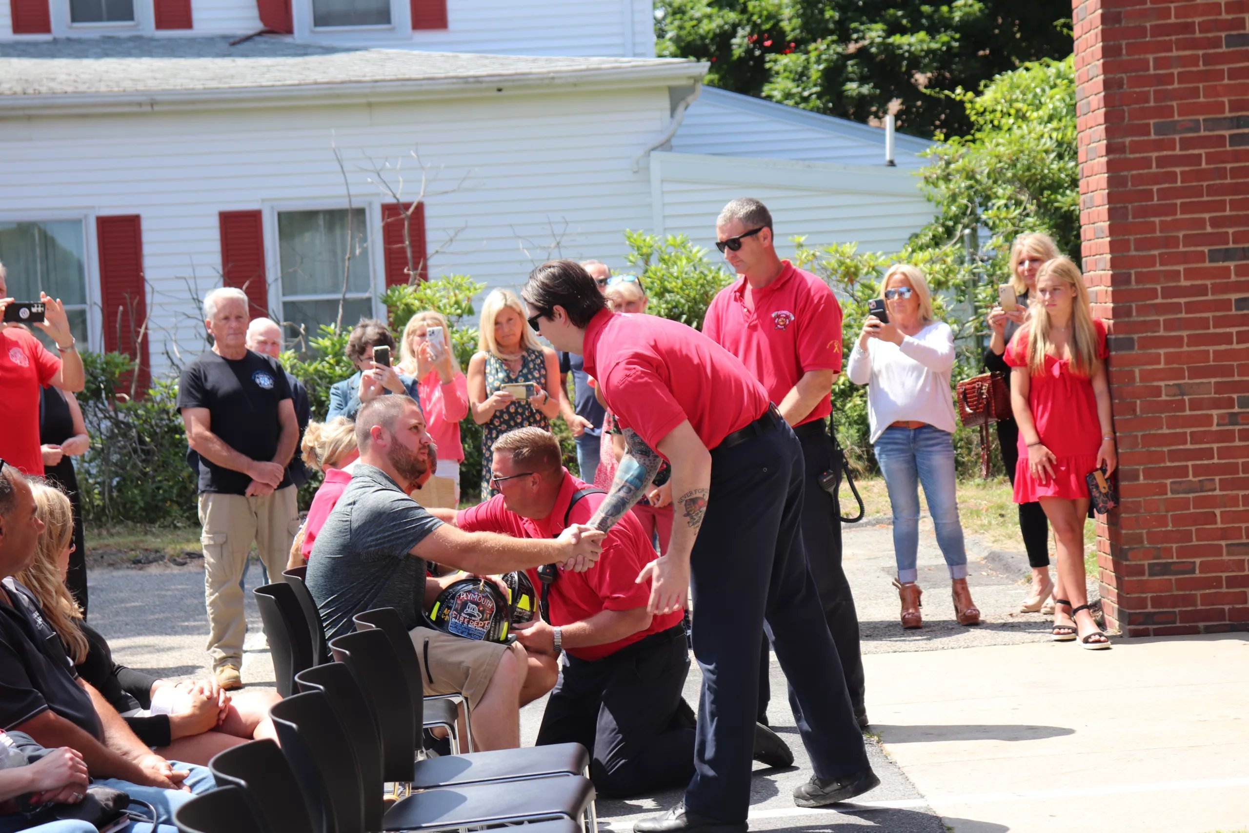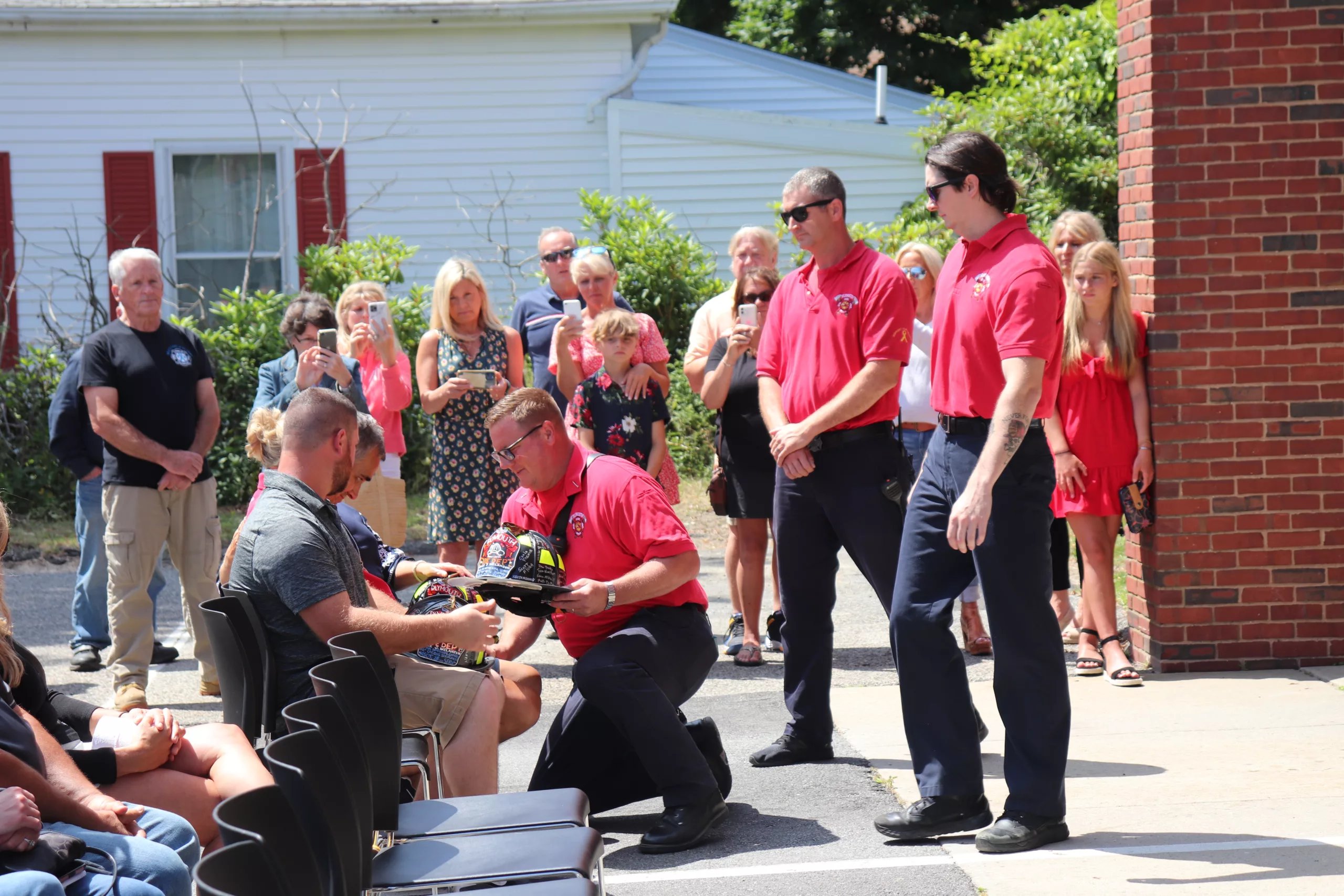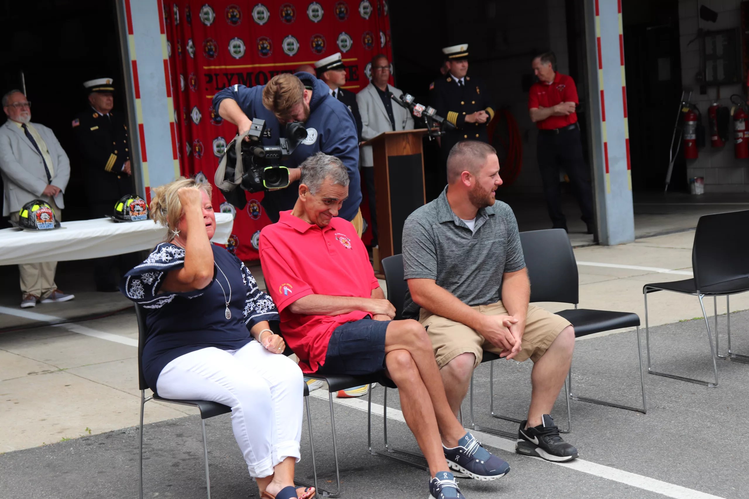 The first helmet was presented to Plymouth Fire Station 2 with Capt. Monty Gray and his crew receiving the helmet. The second helmet was presented to Firefighter Melanson’s Plymouth Fire Station 3 crew, with whom he worked for many years. The helmet to Station 3 was presented by Capt. Mark Stoddart (Ret.) and Firefighter Eric Anthrop. The third helmet then was presented to Firefighter Melanson and his family by Lt. Peter Walsh and his crew on Plymouth Fire E-7.