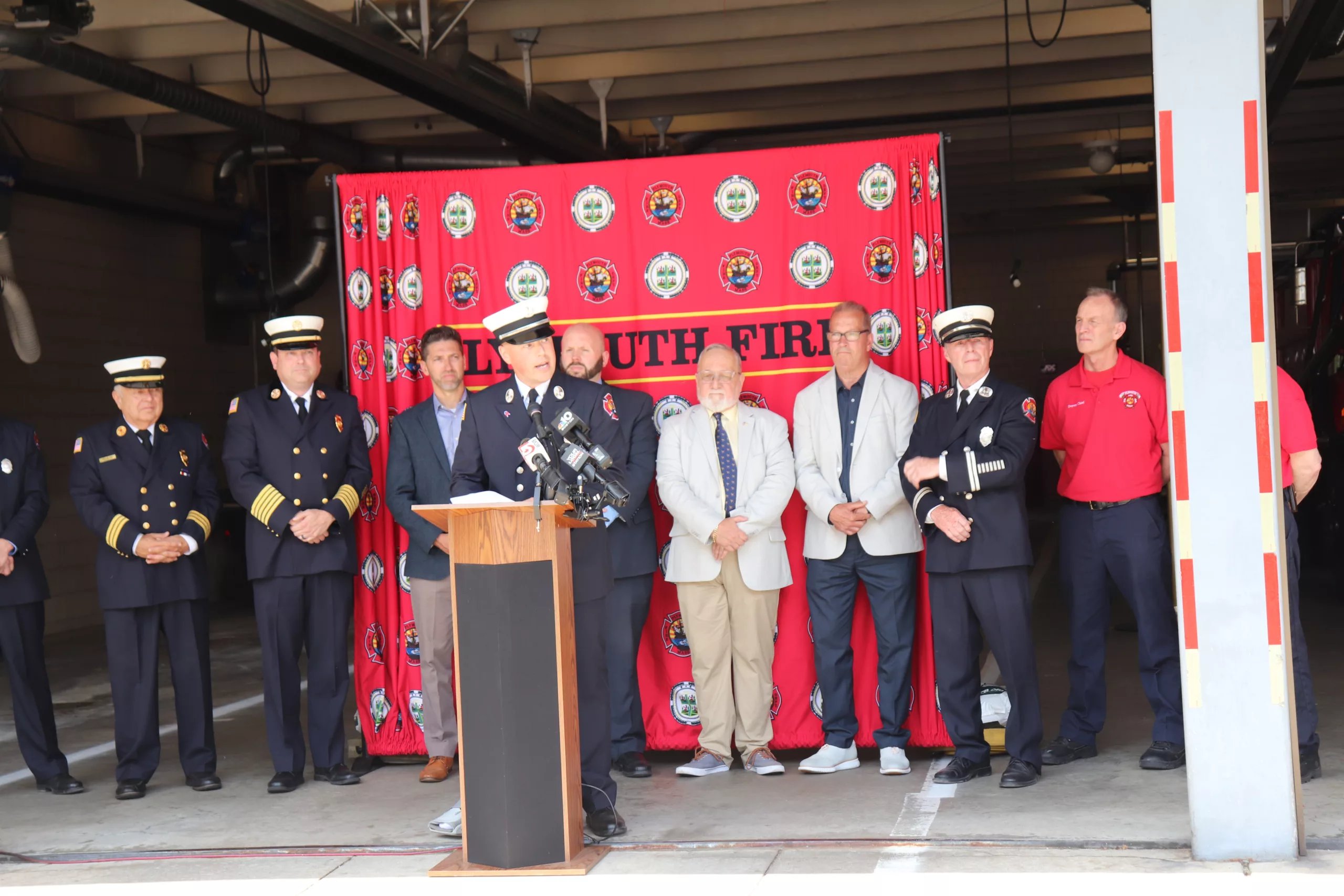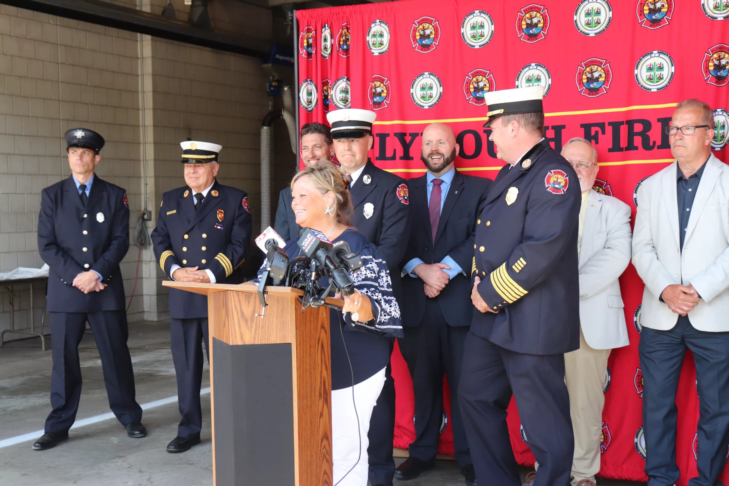 The ceremony began with a procession of fire engines. Firefighter Melanson and his wife Colleen Melanson watched as nine engines made their route from Stephens Field, passing by Station 1 before returning to their respective stations. The final three engines in the procession parked at Station 1 to be part of the ceremony.