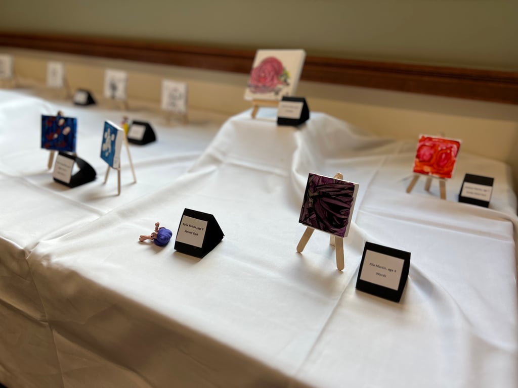 Artwork includes paintings, drawings, sculptures, ceramics, and felt and knitting creations. All artwork is three inches in all dimensions.