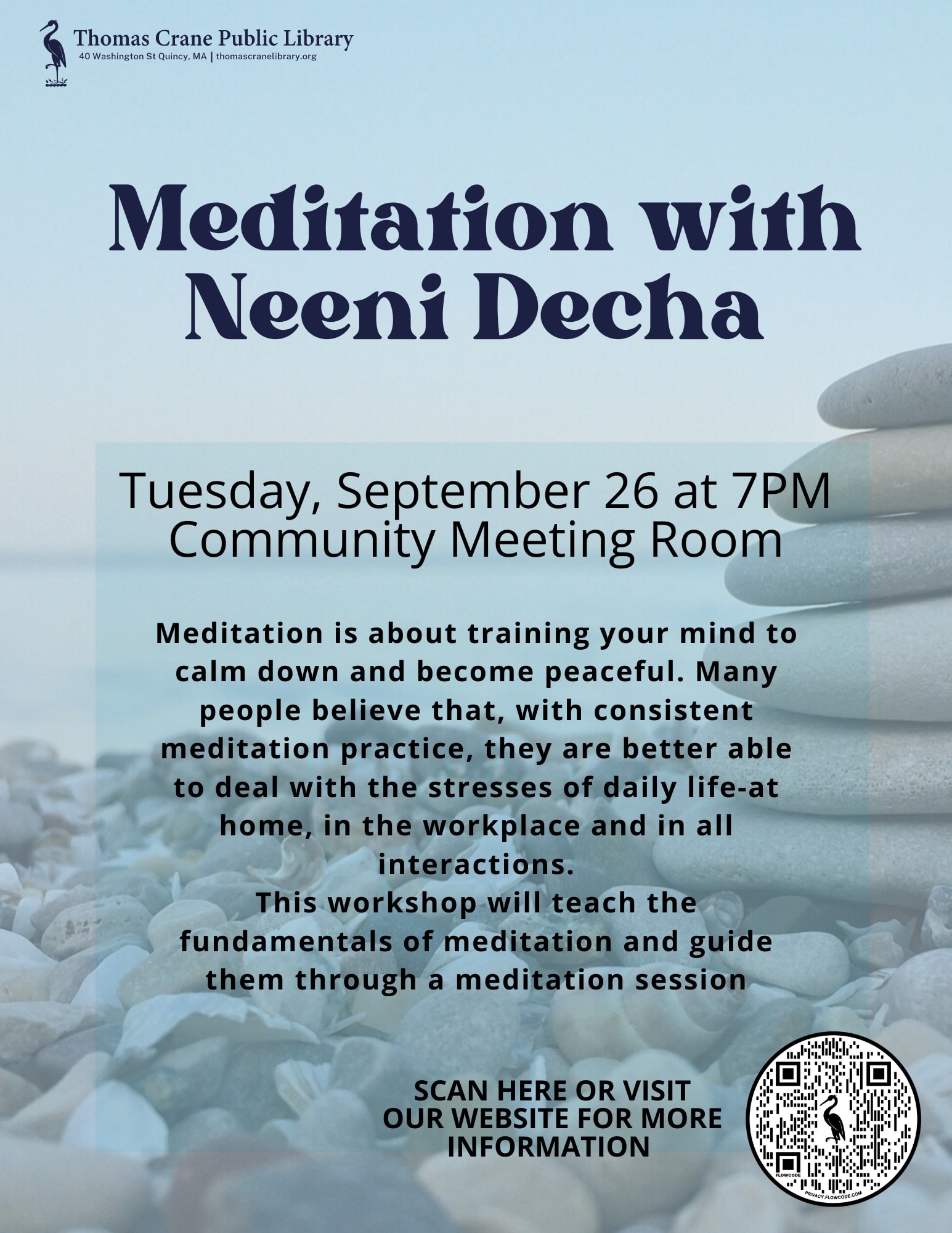 QUINCY — Director Sara Slymon is pleased to share that the Thomas Crane Public Library will be hosting meditation expert Neeni Decha later this month.