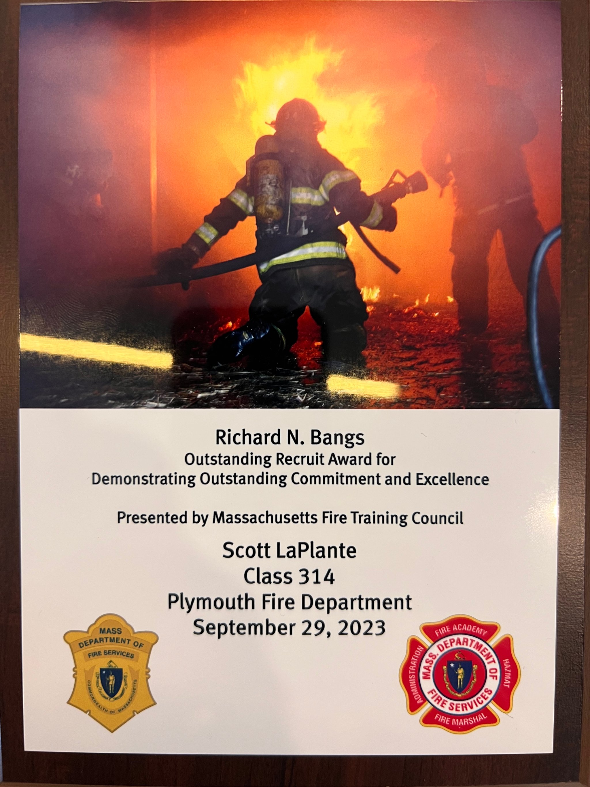 During the ceremony, Firefighter LaPlante was awarded the Richard N. Bangs Award, presented to the outstanding student of the MFA Recruit Class #314. This selection is based on LaPlante’s achievement in both academic exams and practical skills throughout the course of the program.