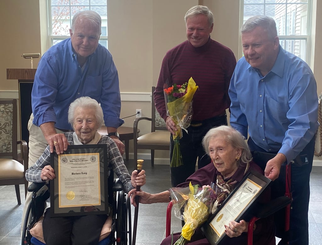 Cronin and Long, who have no relation to one another, joked back and forth about being twins, as neither know who was born first. Both women were overjoyed as they received certificates, and were presented with the Boston Post Cane and flowers from the Select Board.
