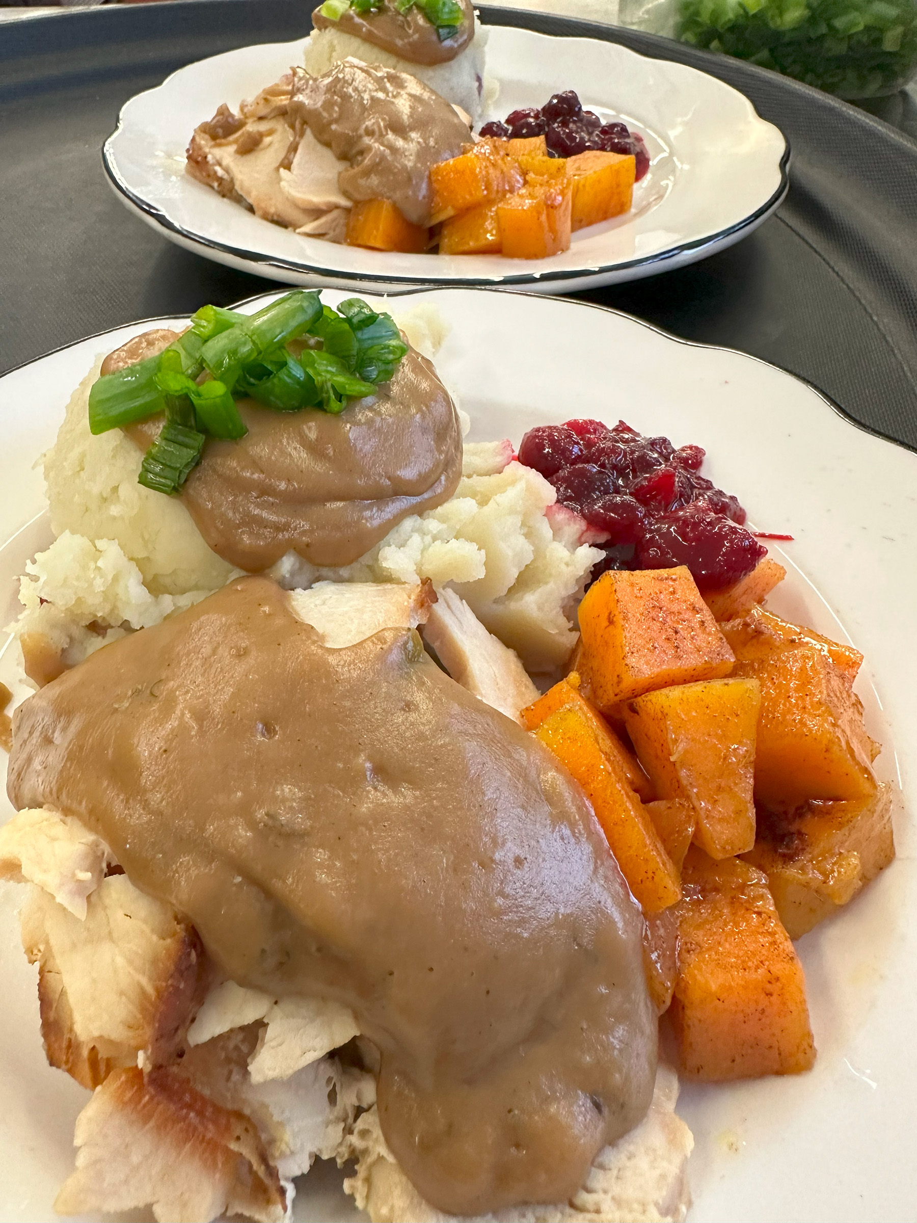 The lunch menu included salad with balsamic vinaigrette, followed by a roasted turkey dinner with mashed potatoes, gravy, house-made cornbread stuffing, roasted butternut squash and house-made cranberry sauce. Dessert consisted of coffee and freshly baked pumpkin pie with whipped cream.
