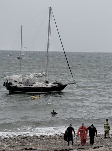 Upon arrival, Plymouth firefighters observed that the sailboat had run aground and was lodged approximately 75-100 feet offshore. Firefighters entered the water in survival gear and made their way toward the vessel.