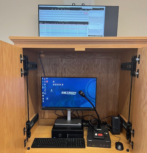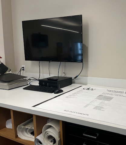 The training room can be split into two rooms depending on the need for space and has an area for Maynard Fire to review building plans for fire prevention. The space also has multiple digital screens, some of which can display dispatch calls, a microphone system, and a projector.