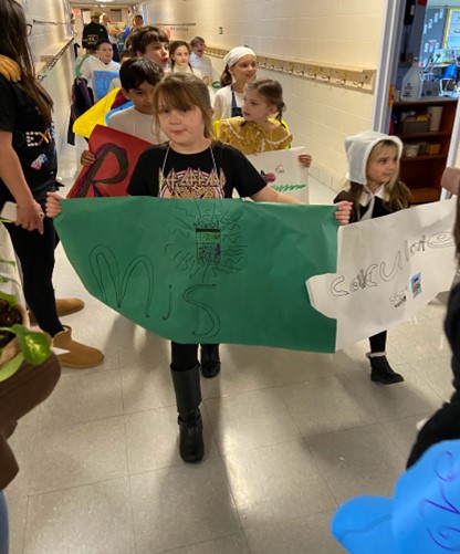 Students created signs and posters and paraded through the hallways to the enjoyment of families and staff. Some staff members joined in the fun, displaying words such as “vibrant,” dexterity,” “inconspicuous,” and “staff.”