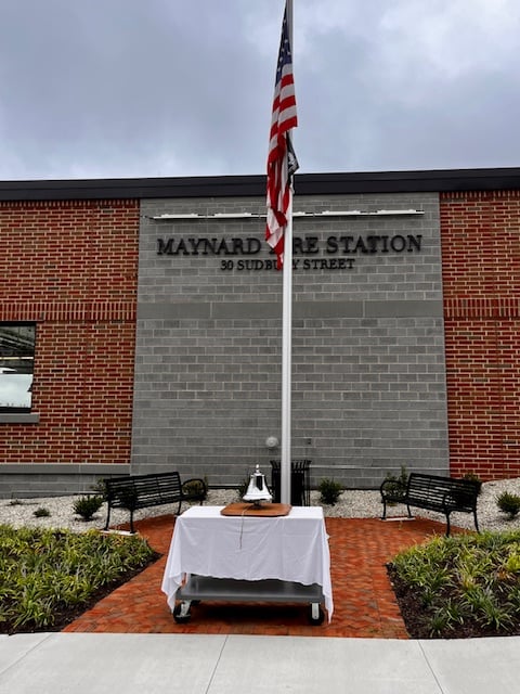 Maynard Fire has an outdoor community space and flagpole located on the street facing side of the station.