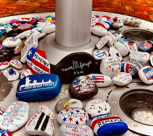 This space is equipped with benches, a flagpole, and painted rocks, created by Maynard Public Schools students to honor 9/11. The flagpole is also lit up at night.
