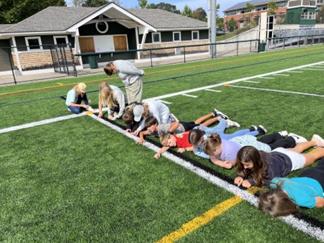 At Manchester Essex Regional Middle School, students in Social Science teacher Kristen Degnan’s Grade 6 class created timelines for a unit on human origins to better understand the vast history of Earth. The students condensed 4.5 billion years into the 100 yards of a football field, plotting major milestones and even recreating what they learned on the High School turf field.