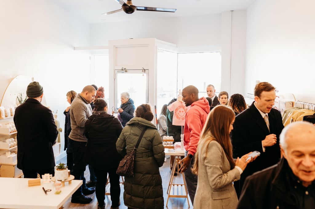 After the ribbon cutting, attendees enjoyed refreshments while exploring the space and talked with the entrepreneurs behind Pure Essentials & Co., StyleMeMomma, and 333 Skin & Bath Co.