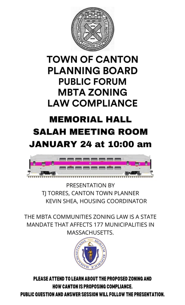 CANTON — Town Administrator Charles Doody, Town Planner TJ Torres and Housing Coordinator Kevin Shea announce that the Town of Canton will hold a public forum this week to discuss the state’s MBTA Communities Multi-Family Zoning Requirements.