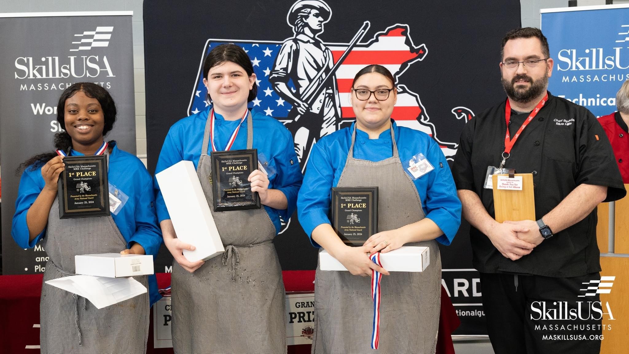 CANTON — Superintendent-Director Jill Rossetti, Principal Geoff Zini and Lead Culinary Arts Instructor Richard Spada are pleased to share that students in the Culinary Arts program at Blue Hills Regional Technical School won the 2024 Massachusetts SkillsUSA MRE Challenge.