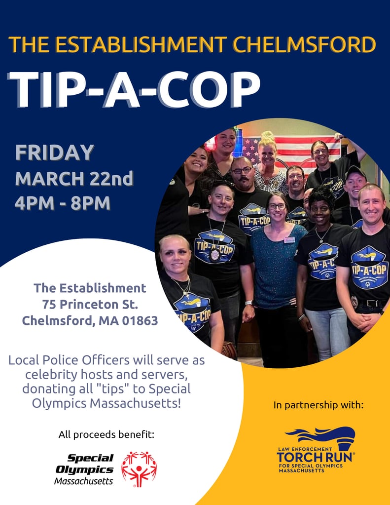 CHELMSFORD – Police Chief Colin Spence is pleased to report that Chelmsford Police officers will join staff at the Establishment in Chelmsford for a Tip A Cop event to raise money for the Special Olympics of Massachusetts.