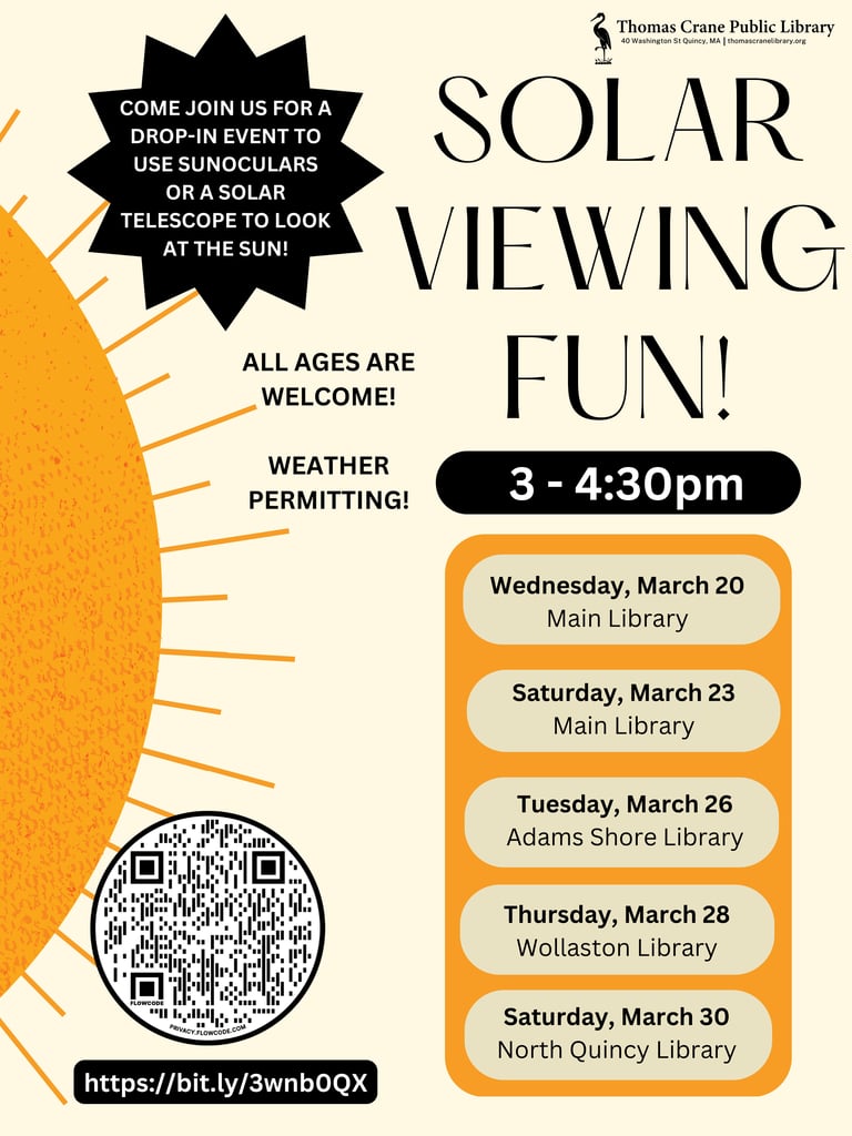 QUINCY — The staff of the Thomas Crane Public Library is proud to invite community members to drop-in solar viewing events at multiple branch locations this month.