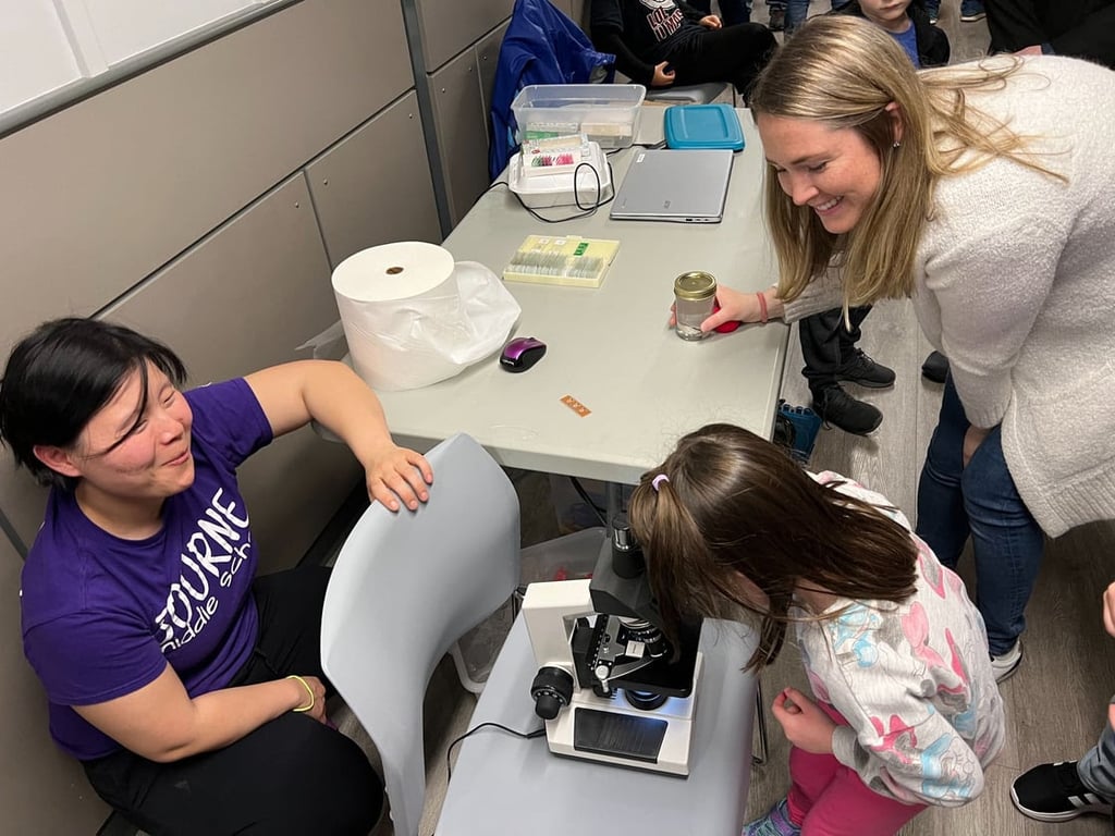 Grade 6 science teacher Olivia Rauss demonstrated a high-resolution microscope, while Bourne High School students from Aimee Jarominski’s AP Biology and Anatomy and Physiology classes showed their younger peers how to pipette using colored water, how to assemble show anatomical models and how to measure CO2 production with Vernier probes.