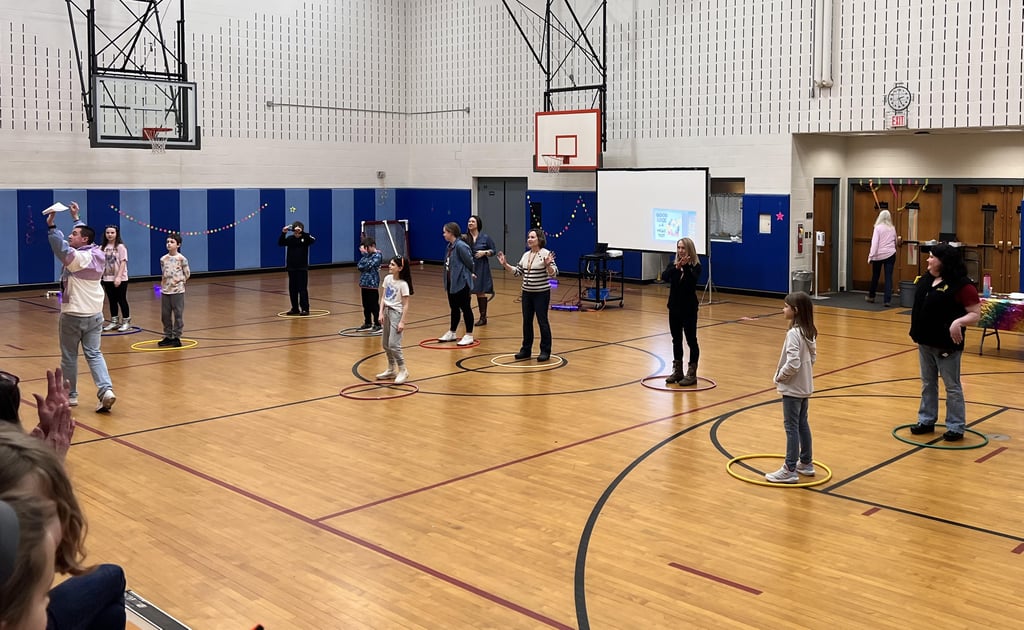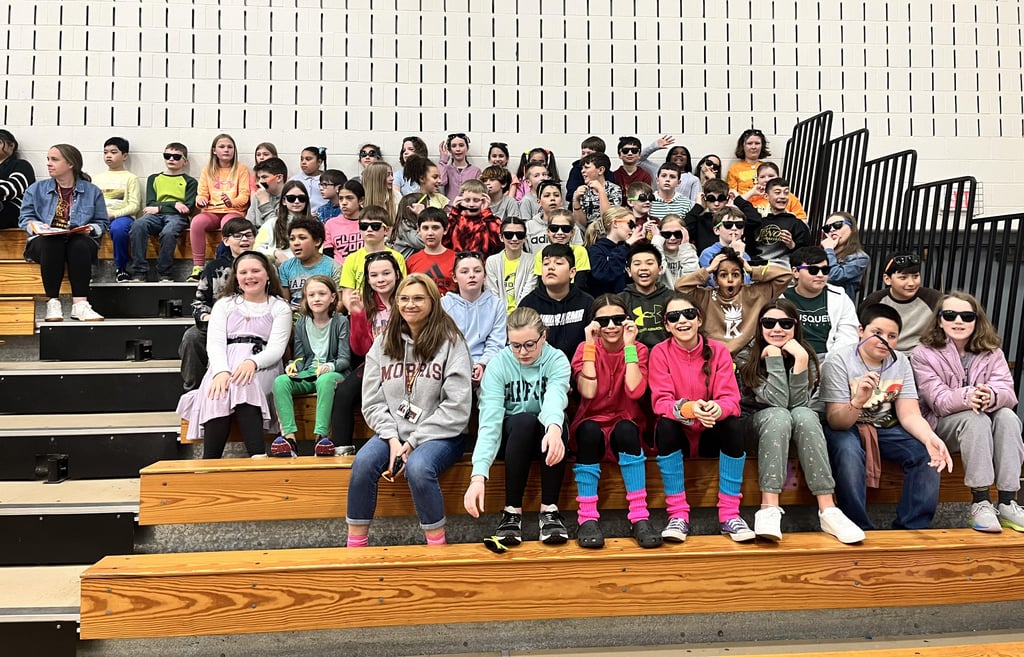 Students in Grades 3-5 were called down next. Each classroom pre-selected a walk-in song for their entrance. Songs included “The Eye of the Tiger” by Survivor, “High Hopes” by Panic! At the Disco, “Roar” by Katy Perry, “Thunderstruck” by AC/DC, and more. Upon their entry, each student was given a pair of sunglasses to wear and take home.