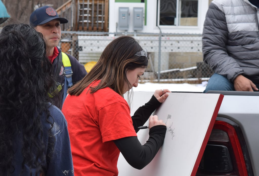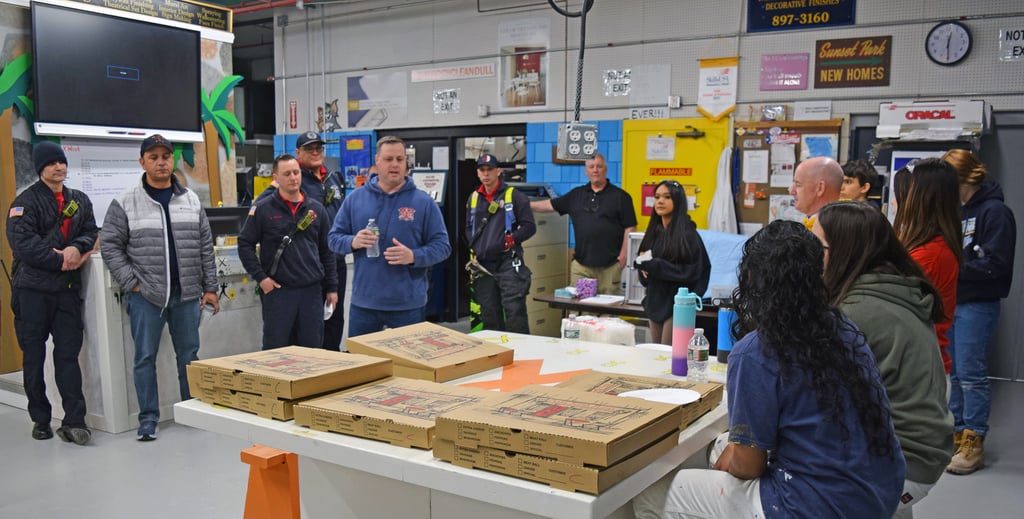 The finished signs were presented by the students and instructors in the Painting and Design program on Friday, April 5, 2024, to Assistant Fire Chief David Keene and firefighters from the West Sixth Street Station. The firefighters brought over and shared pizza with the students and instructors and thanked them for their work. The students who contributed to the project signed the back of the two signs and with their instructors posed for photos with the firefighters.