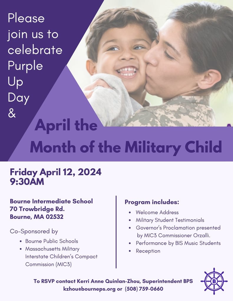 BOURNE — Bourne Public Schools and the Massachusetts Military Interstate Children’s Compact Commission (MIC3) will host a Purple Up Day event on Friday to support children of military families.