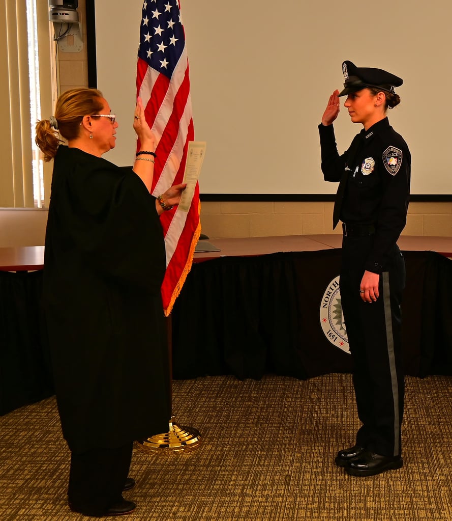 Officer Casey McAuliffe was sworn in as a full-time officer during a ceremony on Tuesday, April 16 after graduating from the Merrimack College Police Academy on Friday, April 12.