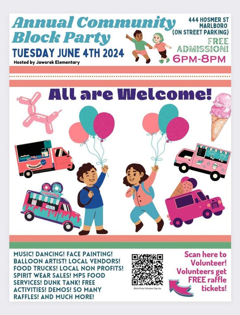 The block party will be held Tuesday, June 4, at Jaworek Elementary School from 6-8 p.m. Admission is free. Jaworek parent DJ Brentley will host.