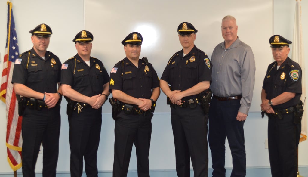 From left, Capt. Dan Hanafin, Chief Thomas Browne, Sgt. Sage Costa, Lt. Kevin Doherty, Deputy Chief Robert Kirchner, and Capt. Kevin Cooney at the ceremony. (Photo Courtesy Burlington Police Department)