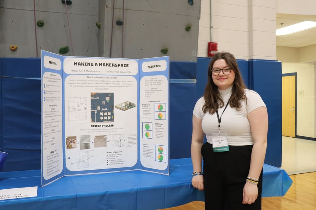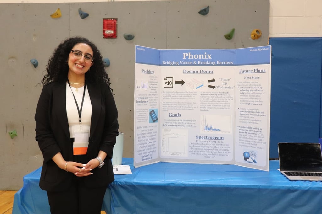 Meray Khela with her project, Phonix: Bridging Voices & Breaking Barriers, at the Medway High School Innovation Showcase on May 1. (Photo courtesy Medway Public Schools)