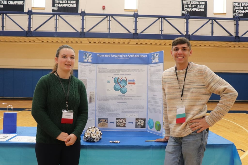 Ava Fahey (left) and Sam Maurer with their project, Truncated Icosahedron Artificial Heart, at the Medway High School Innovation Showcase on May 1. Truncated Icosahedron Artificial Heart was awarded second place by judges. (Photo courtesy Medway Public Schools)