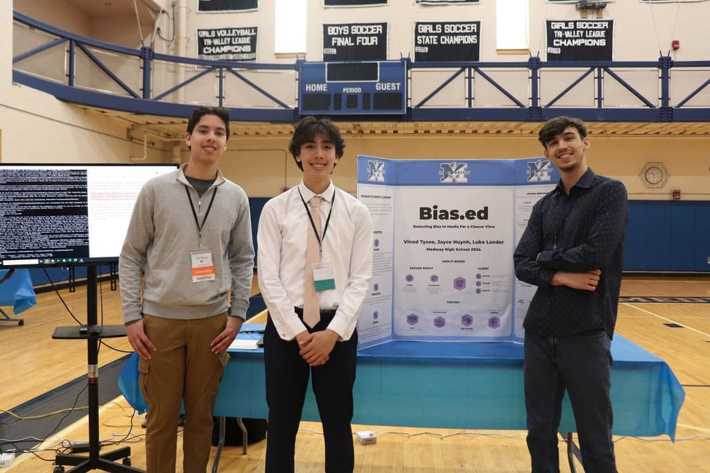 From left: Vinod Tysoe, Jayce Huynh and Luke Lander with their project, Bias.ed, at the Medway High School Innovation Showcase on May 1. Bias.ed was awarded third place by judges. (Photo courtesy Medway Public Schools)