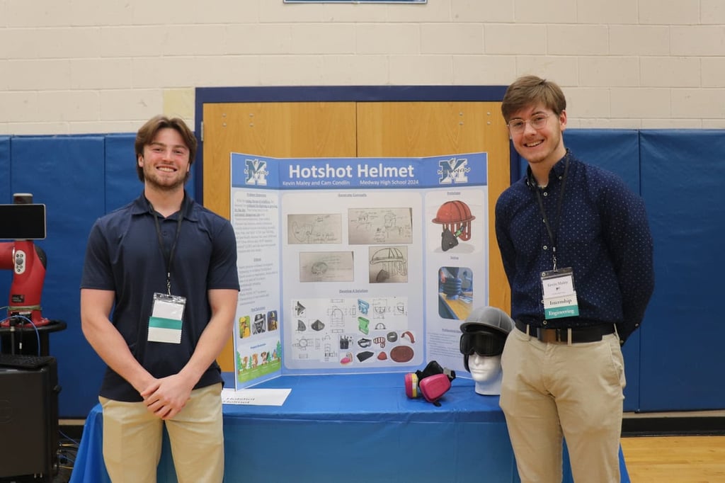 Cam Condlin (left) and Kevin Maley with their project, Hotshot Helmet, at the Medway High School Innovation Showcase on May 1. (Photo courtesy Medway Public Schools)