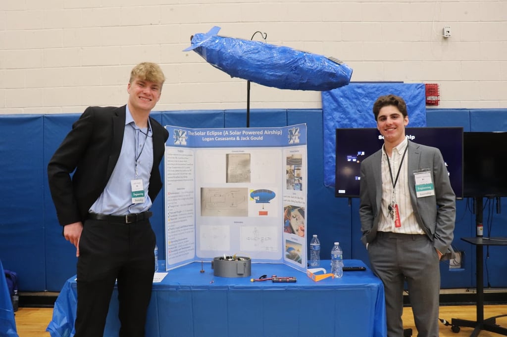 Jack Gould (left) and Logan Casasanta with their project, Solar Powered Electric Airship, at the Medway High School Innovation Showcase on May 1. (Photo courtesy Medway Public Schools)